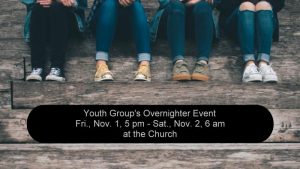 The Youth Group is having an Overnighter Event from Friday, November 1, 2024, at 5:00 pm through Saturday, November 2, 2024, at 6:00 am, at the church.