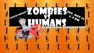 Calling all Humans from Calvary Baptist Church’s Youth Group to join with the Youth Group of North Avenue Church of God in defeating the Zombies on Saturday, October 25, 2025, from 6:00 pm to 9:00 pm.